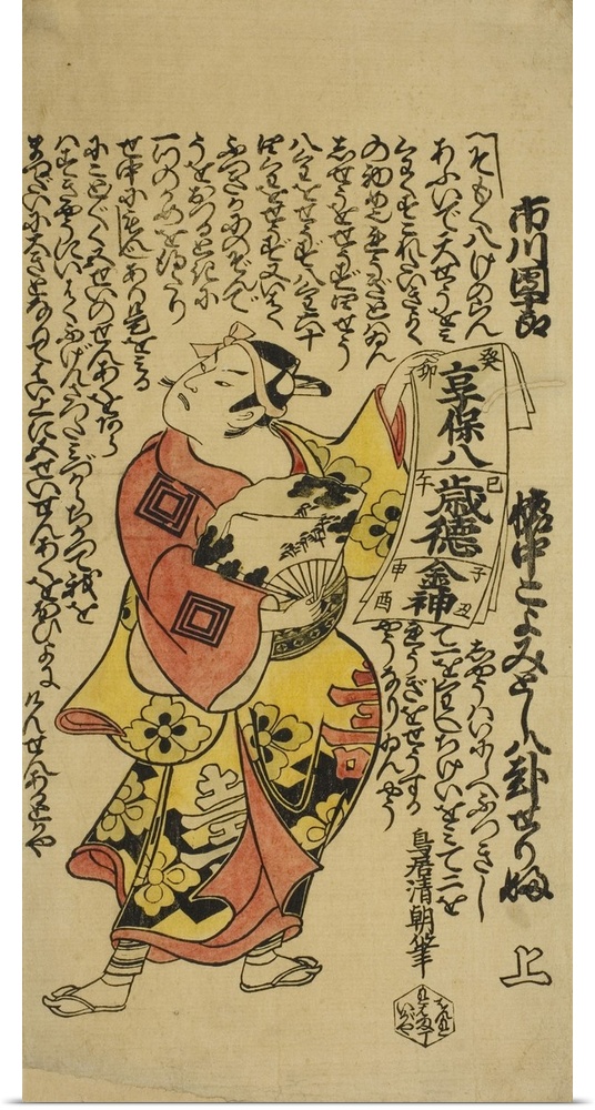 <p>The Actor Ichikawa Danjuro II as Soga no Goro in the play Soga Koyomi Biraki, performed at the Nakamura Theatre in the first month, 1723, hand-coloured woodblock print.</p>