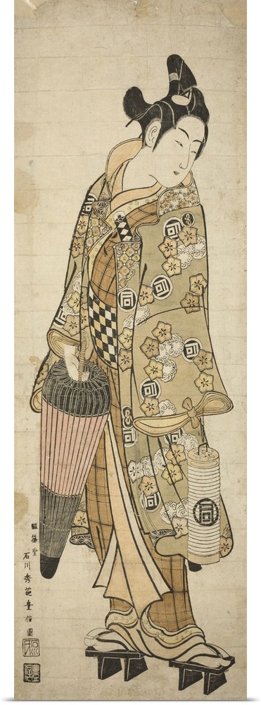 <p>The Actor Sanogawa Ichimatsu I as a young man holding an umbrella and a lantern, c.1748, hand-coloured woodblock print.</p>
