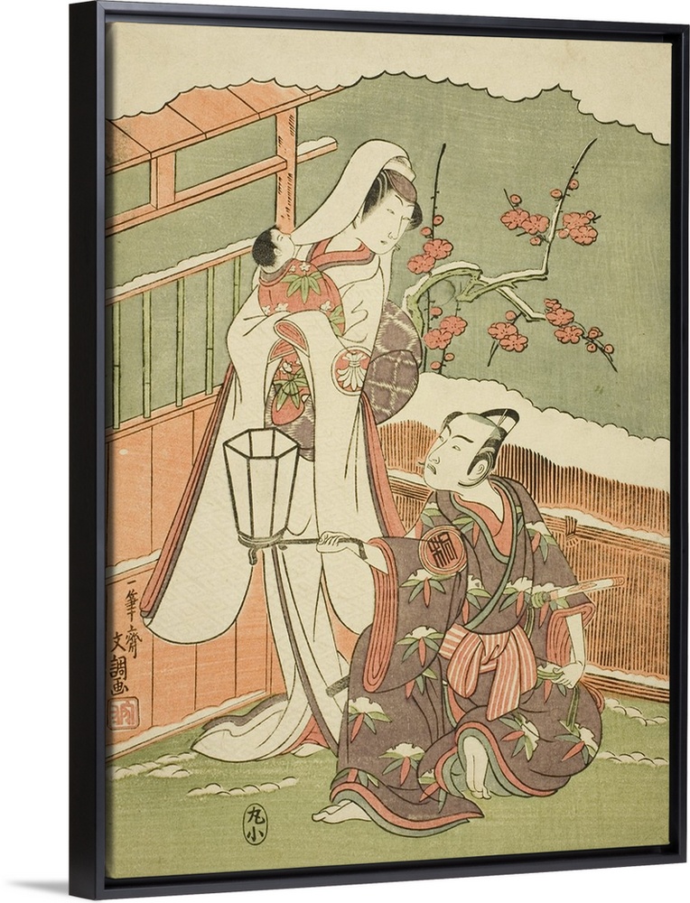 <p>The Actors Arashi Sangoro II as Minamoto no Yoritomo Disguised as the Hat Maker, Ebosi Ori Daitaro, and Segawa Kikunojo II as the Snow Woman, Yuki Onna, in the Dance Sequence Oyama Beni Yuki no Sugao, Courtesan's Rouge on a Snow White Face, from the Final Act of the Play Myotogiku Izu no Kisewata, Cotton Wadding of Izu Protecting the Matrimonial Chrysanthemums, Performed at the Ichimura Theater from the First Day of the Eleventh Month, 1770, c.1770, colour woodblock print; chuban.</p>