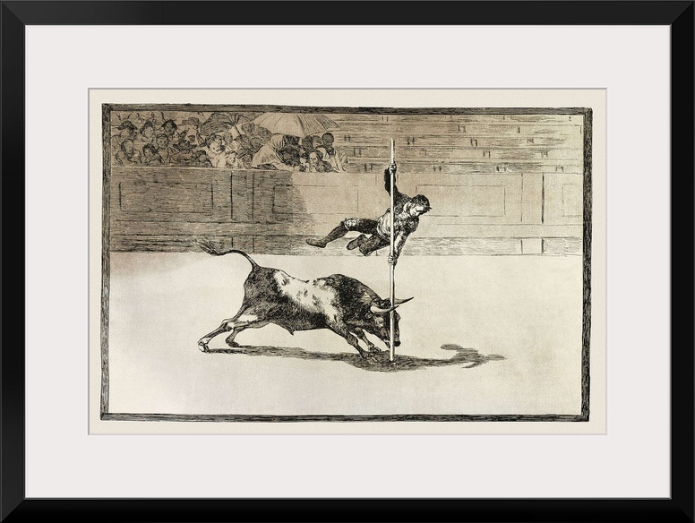 <p>GOYA Y LUCIENTES, Francisco de (1746-1828). The agility and audacity of Juanito Apinani in the ring at Madrid. 1816. Plate 20 of "The Art of Bullfighting". Etching. SPAIN. Madrid. National Library. .. AISA/Everett Collection</p>