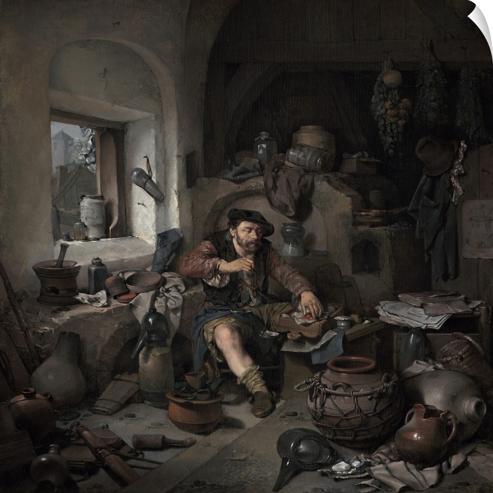 <p>The Alchemist, by Cornelis Bega, 1663, Dutch painting, oil on canvas. Unkempt figure of an alchemist sits among a chaotic jumble of paraphernalia. The alchemist is a subject of ridicule, wasting time on futile activity. The assorted cracked clay and glass</p>