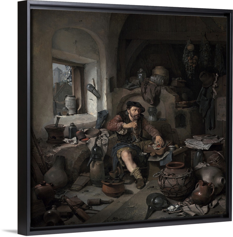 <p>The Alchemist, by Cornelis Bega, 1663, Dutch painting, oil on canvas. Unkempt figure of an alchemist sits among a chaotic jumble of paraphernalia. The alchemist is a subject of ridicule, wasting time on futile activity. The assorted cracked clay and glass</p>