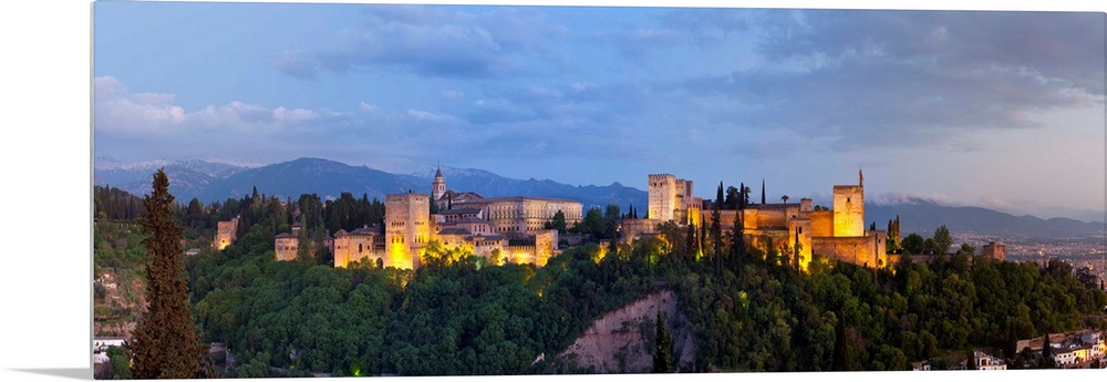 <p>The dramatic Alhambra Palace illuminated at dusk, Granada, Granada Province, Andalucia, Spain</p>