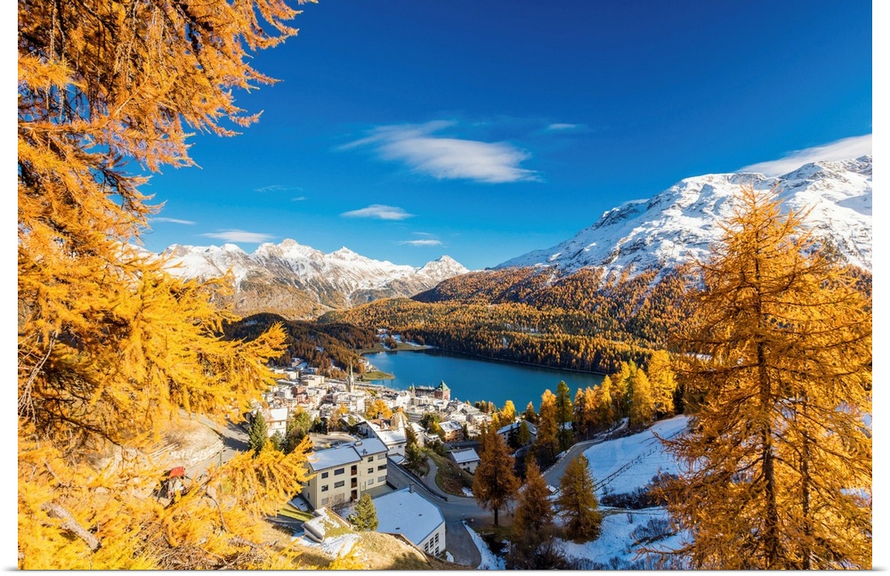 <p>The alpine village of St. Moritz framed by colorful woods and the blue lake, Canton of Graubunden, Engadine, Switzerland</p>