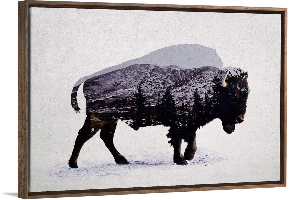 <p>A contemporary piece of artwork of a wilderness scene withing the outline of an American bison.</p>