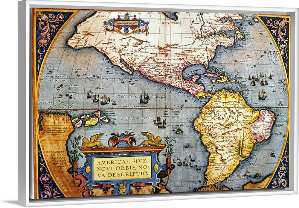 <p>Antique map of North and South America with continents, bodies of water, and longitude and latitude.</p>