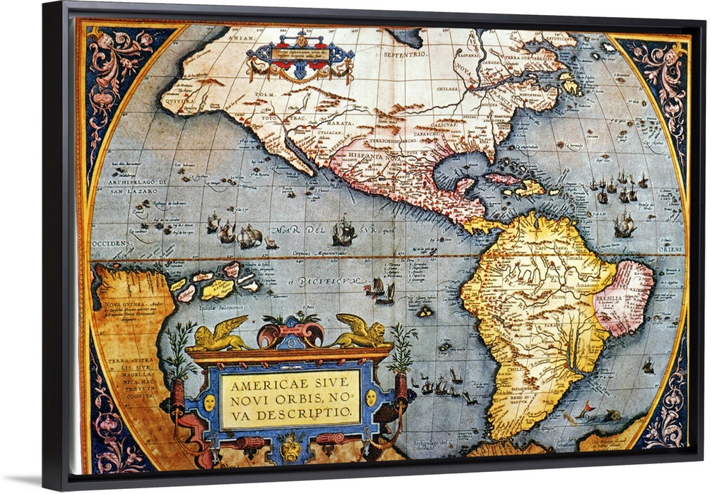 <p>Antique map of North and South America with continents, bodies of water, and longitude and latitude.</p>