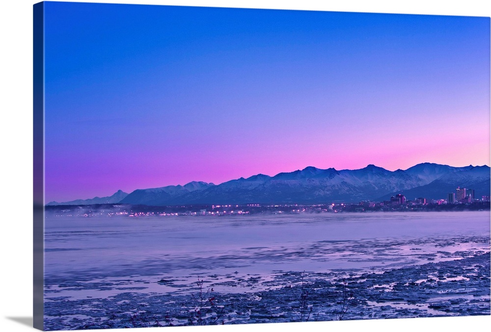 <p>The Anchorage Skyline before dawn with fog rising from the waters of Knik Arm as seen from Earthquake Park, Southcentral, Alaska</p>