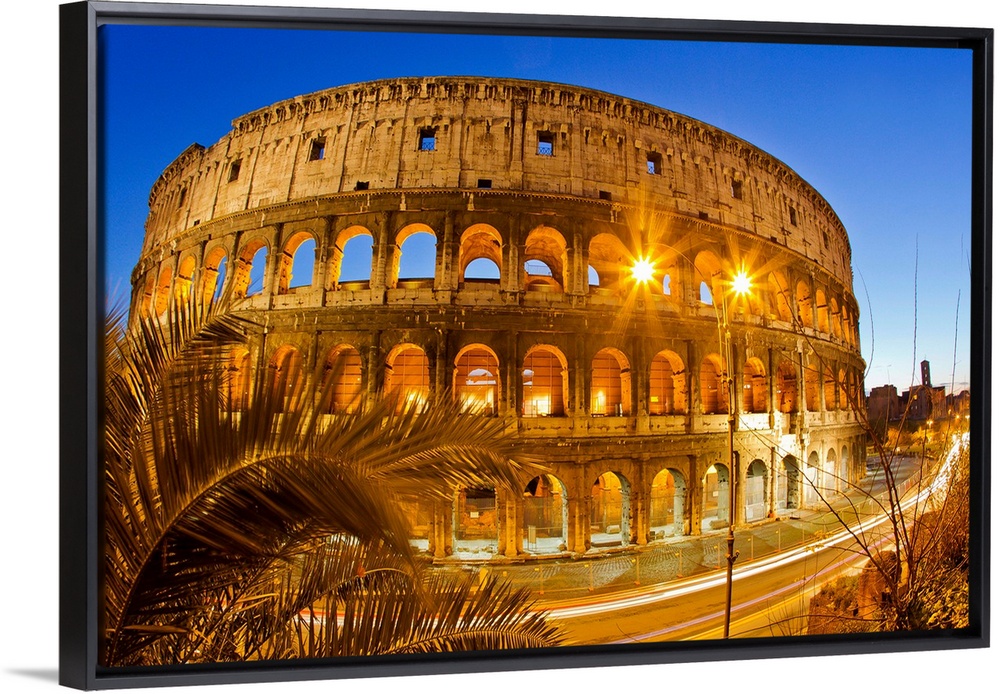 <p>The ancient Roman Colosseum casts an illuminated golden light at dusk.</p>