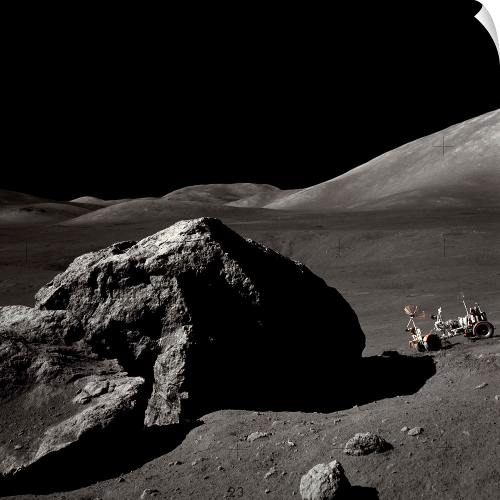 <p>The Apollo 17 lunar rover sits on a slope near a large rock in the Moon's Taurus-Littrow Valley. | Location: Taurus-Littrow Valley, Moon.</p>