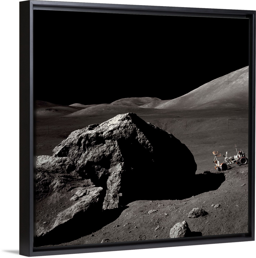 <p>The Apollo 17 lunar rover sits on a slope near a large rock in the Moon's Taurus-Littrow Valley. | Location: Taurus-Littrow Valley, Moon.</p>