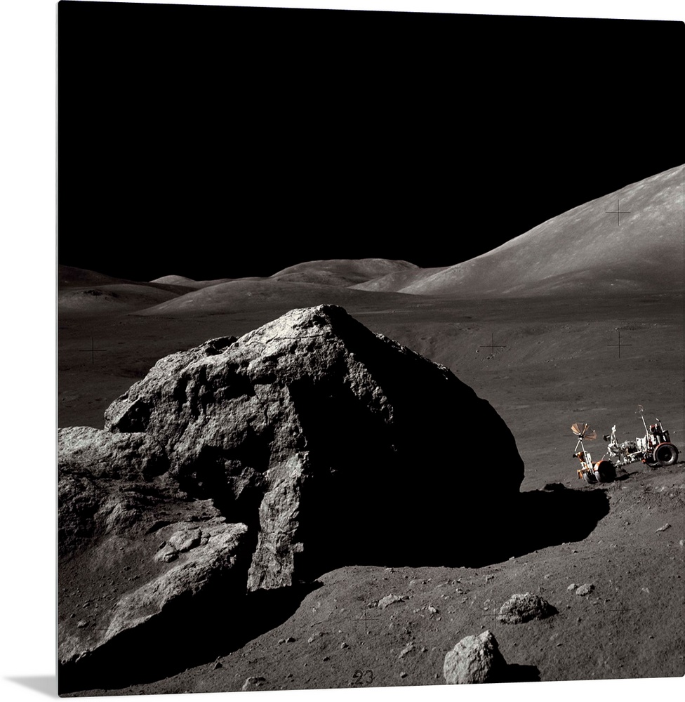 <p>The Apollo 17 lunar rover sits on a slope near a large rock in the Moon's Taurus-Littrow Valley. | Location: Taurus-Littrow Valley, Moon.</p>