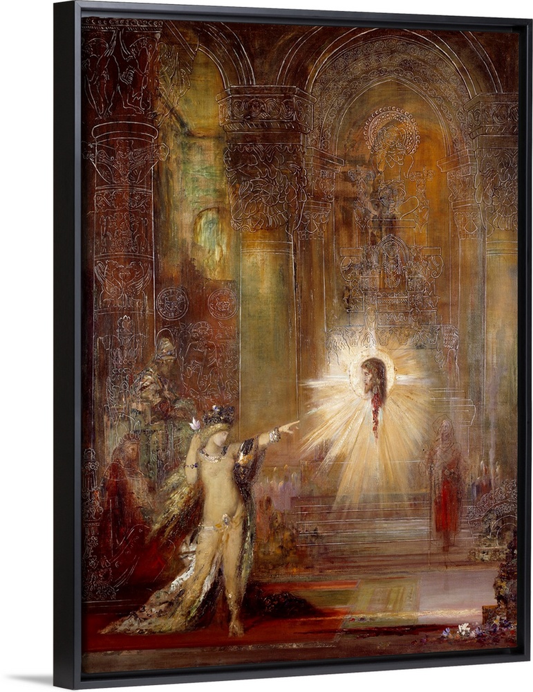 <p>The Apparition also called Dance of Salome. After her dance in the banquet hall of Herod, Salome asks the head of Saint John the Baptist. In the painting, she points the finger at the head of the prophet in levitation while Herodias stands behind her. Painting by Gustave Moreau (1826-1898), circa 1876. 103 x142 cm. Gustave Moreau Museum, Paris</p>