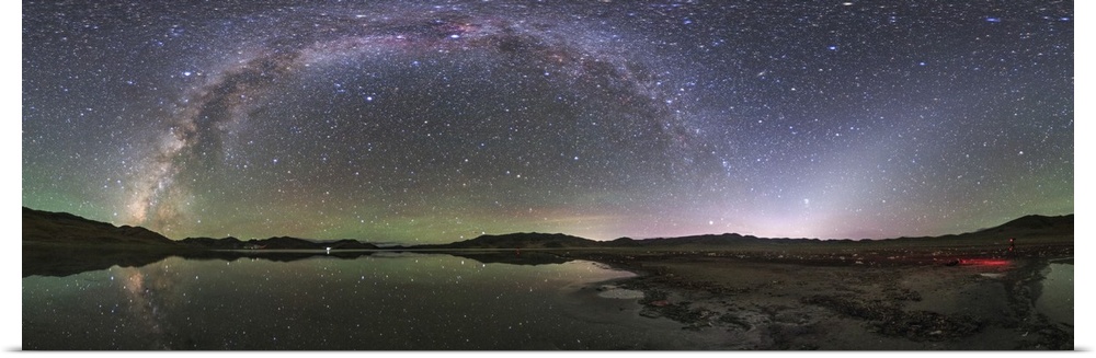 <p>Tibetan sky at the break of dawn, The arc of the Milky Way from Sagittarius to Perseus and the cone shape of zodiacal light appear over Yamdrok Lake, Tibet, China. Yamdrok Lake is one of the three largest sacred lakes in Tibet. Both the Milky way and the airglow are beautifully reflected in the lake...s calm waters.</p>