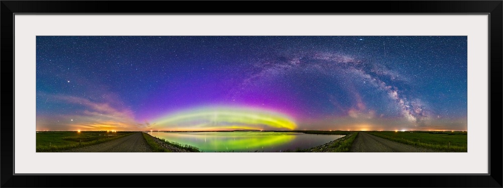 <p>The arc of the northern lights and auroral oval over Crawling Lake, Alberta, Canada.</p>