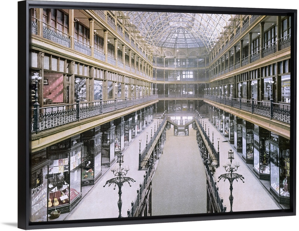 <p>A vintage picture taken inside of the arcade showing various shops on three levels on both sides of the building.</p>