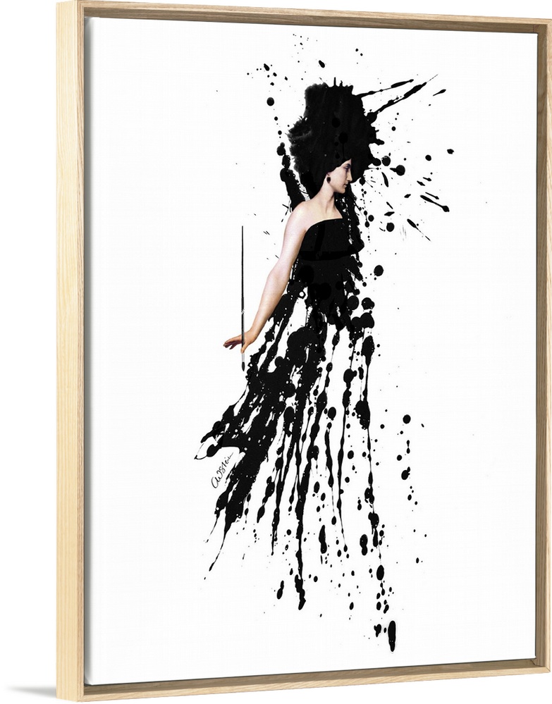 <p>A woman holding a paint brush has an outfit made out of black paint splatters.</p>