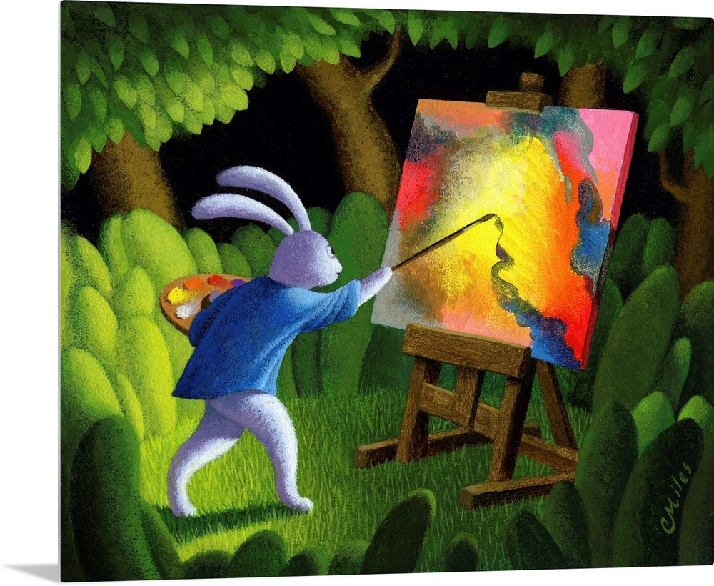 <p>Portrait of a rabbit painting an abstract art piece in the woods.</p>