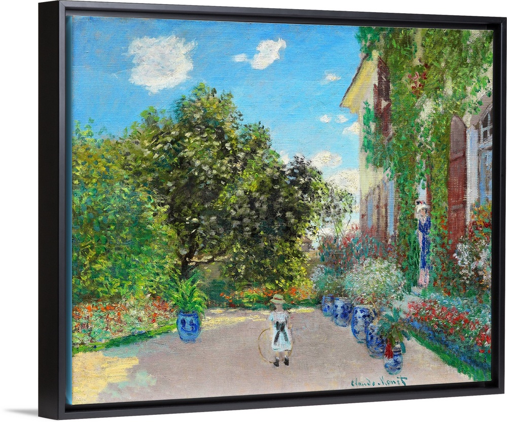 <p>Claude Monet and his family lived at Argenteuil, outside Paris, from 1871 to 1878. Here he depicted his five- or six-year-old son, Jean, playing with a hoop and his wife, Camille, standing in the doorway of their vine-covered house. The pleasant weather and neatly kept garden, a forerunner of the artist's celebrated garden at Giverny, give a sense of tranquility and well-being to this painting. This was a period of financial security for Monet thanks to recent sales of his work to the Paris art dealer Paul Durand-Ruel.</p>