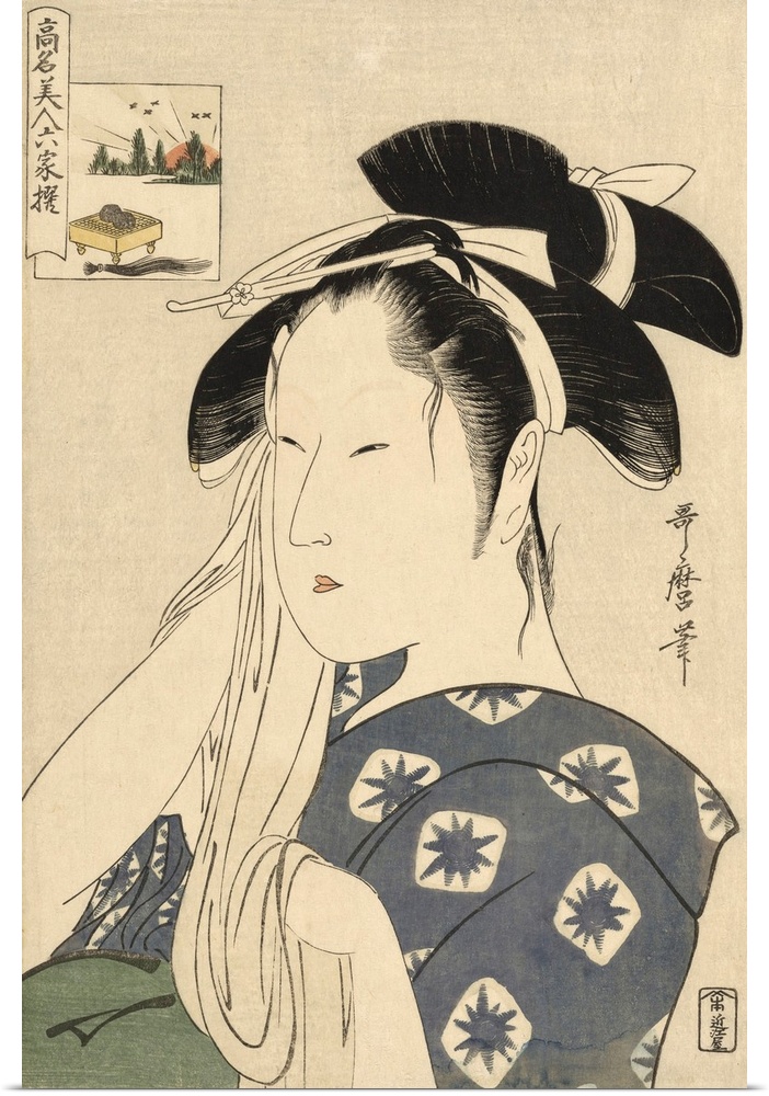 <p>The Asahiya Widow, from the series Renowned Beauties Likened to the Six Immortal Poets, Komei bijin rokkasen, c. 1795-96, color woodblock print.</p>