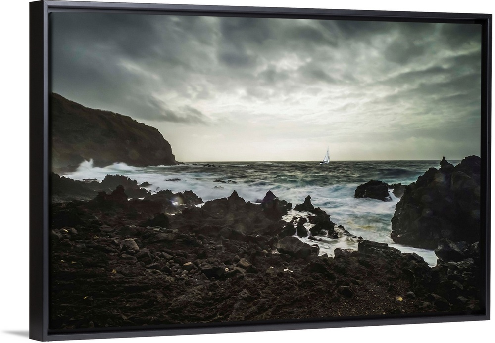 <p>Rugged landscape along the Atlantic coast with a yacht in a storm; Sao Miguel Island, Azores, Portugal</p>