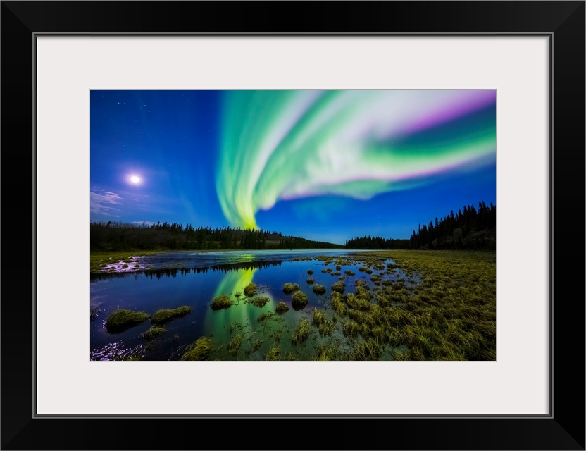 <p>The aurora borealis competes against the moon in the night sky above a partially-thawed beaver pond in the spring; Alaska, United States of America</p>
