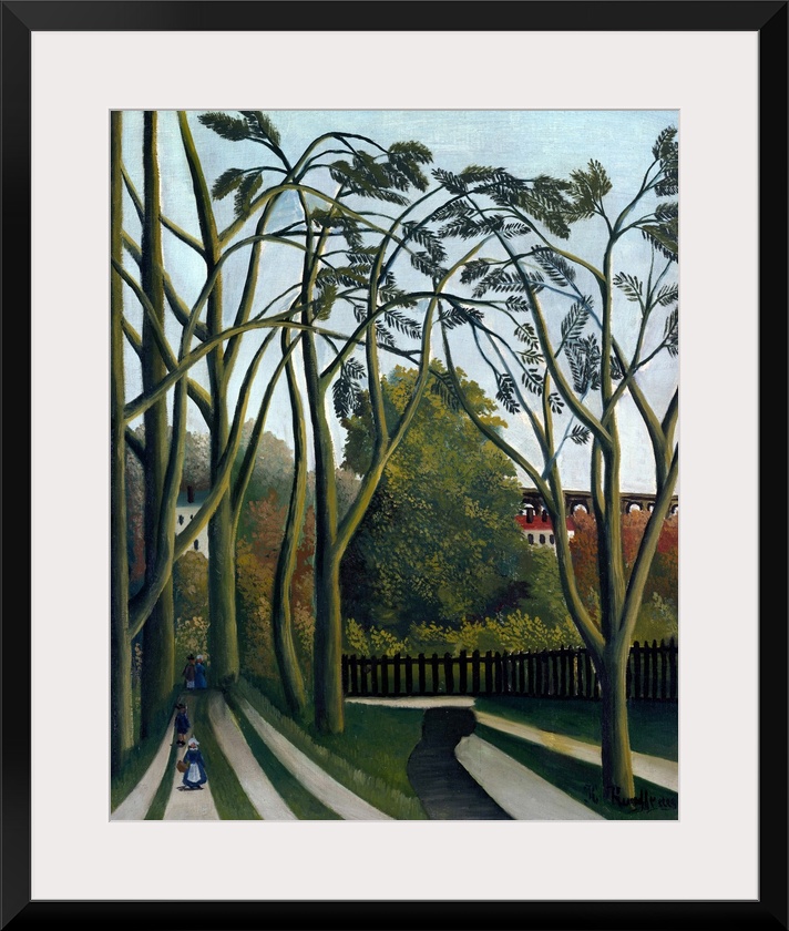 <p>Rousseau identified the subject of this painting in a handwritten note, affixed to its stretcher, dated 1909, the year he consigned it for sale to the dealer Ambroise Vollard. The scene depicts the landscape around Bicetre, a working-class community on the southern edge of Paris near the Bievre river (now buried underground as it courses through the city). In Rousseau's day, the waterway was heavily polluted, but certain spots still offered picturesque views, as suggested by the figures in peasant dress on the tree-lined path at left, and the glimpse of the seventeenth-century aqueduc d'Arcueil in the background.</p>