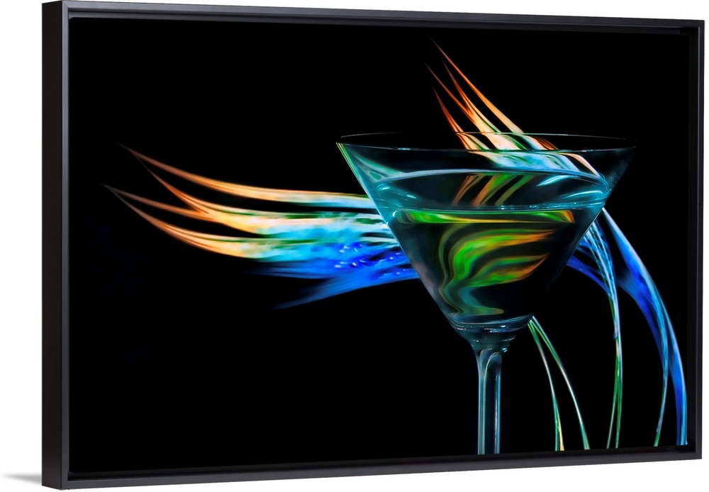 <p>Up-close photograph of a martini glass with colorful waves of light behind it.</p>