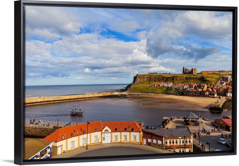 <p>The "bark endeavour", a replica sailing ship, part of the Captain Cook experience, sailing into harbor, with the old boatman's shelter apartments in front and Whitby Abbey behind, north Yorkshire coast, England.</p>