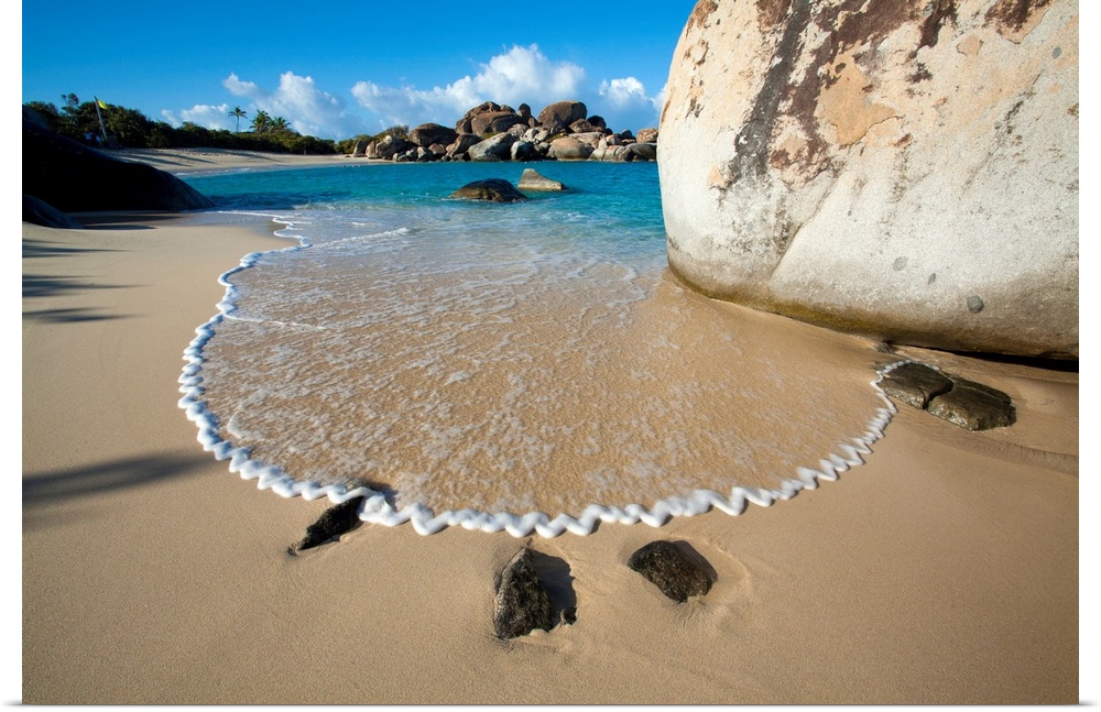 <p>Stunning view of the sandy beach with surf forming a zigzag pattern in the foam next to the large, boulders lining the shores at The Baths, a famous beach in the BVI's, Virgin Gorda, British Virgin Islands, Caribbean</p>