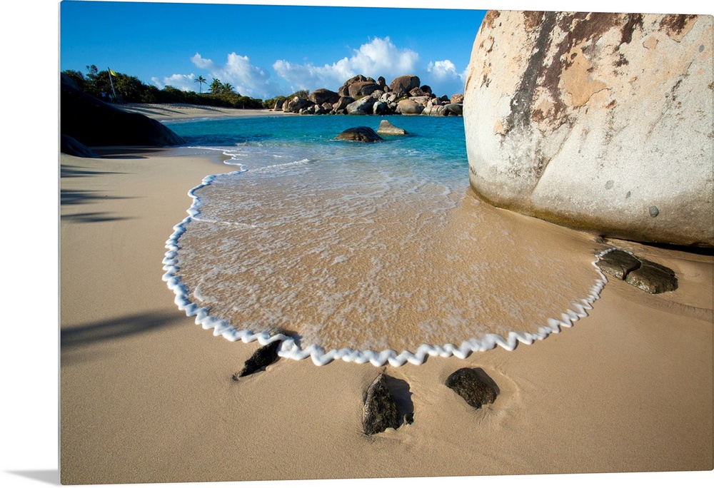 <p>Stunning view of the sandy beach with surf forming a zigzag pattern in the foam next to the large, boulders lining the shores at The Baths, a famous beach in the BVI's, Virgin Gorda, British Virgin Islands, Caribbean</p>