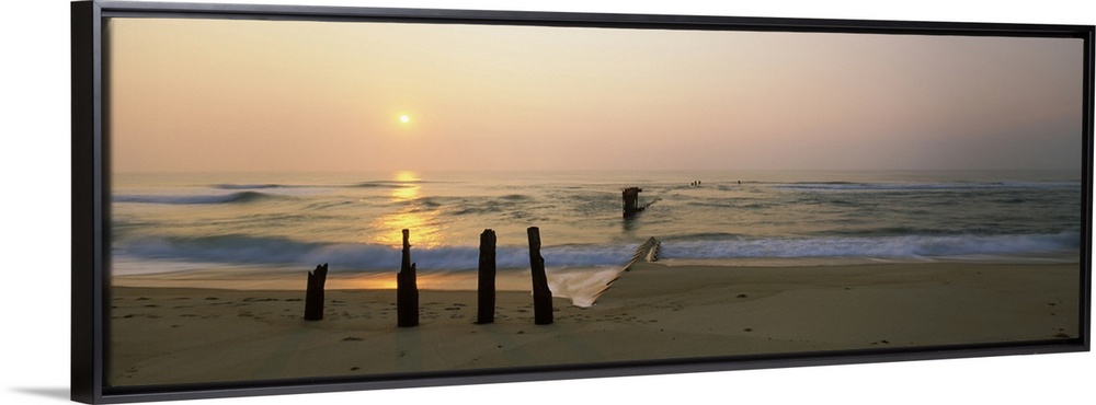 <p>Posts and tide break on the beach at sunrise, Cape Hatteras National Seashore, North Carolina, USA</p>