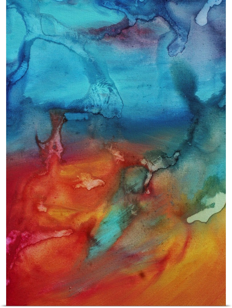 <p>Vertical abstract painting of cool colors merging into warm colors.</p>
