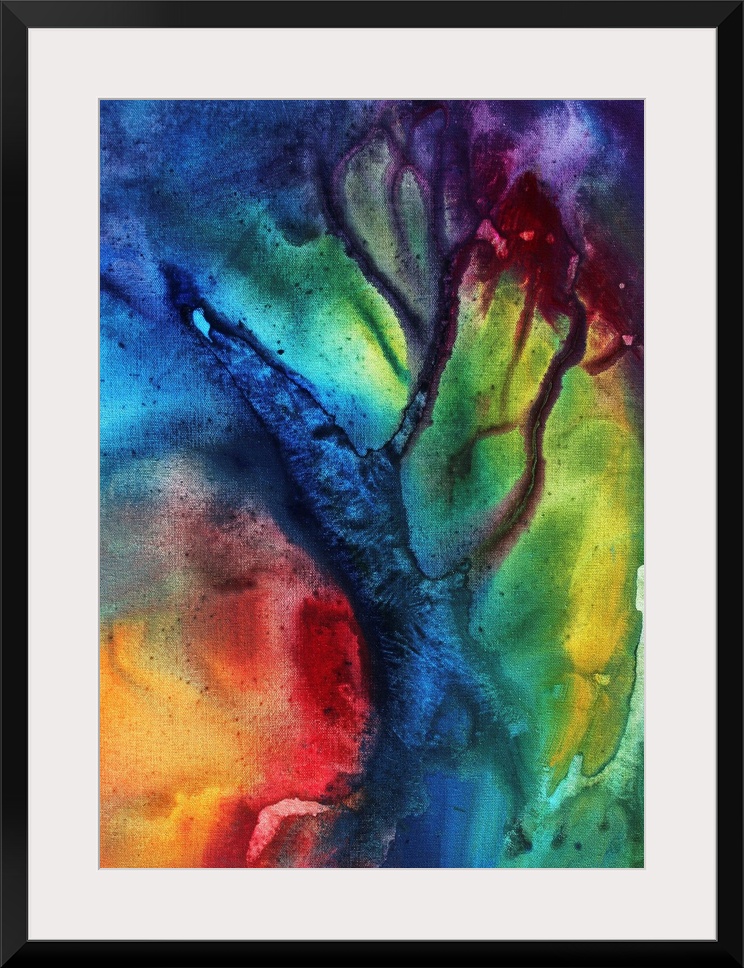 <p>Abstract artwork that has fluid colors of reds, yellows, magenta, violet and blue accented with bursts of purple and burgundy make the viewer feel as if they are looking into a distant galaxy.</p>