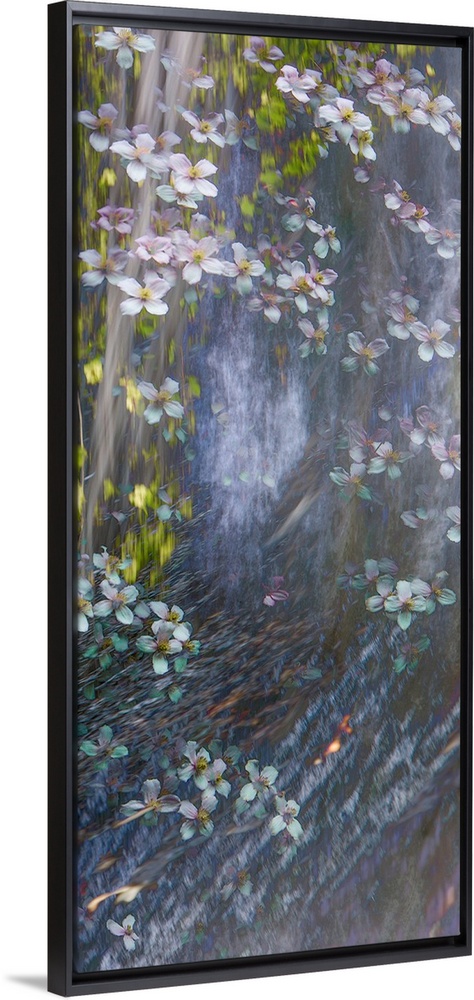 <p>Panel sized photograph with a dreamy look of flowers floating down a river.</p>