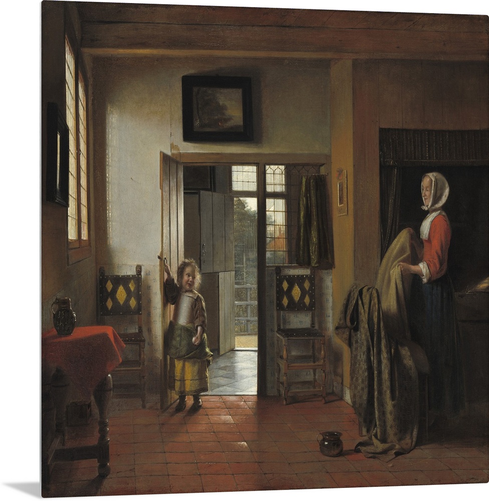 <p>The Bedroom, by Pieter de Hooch, 1658-90, Dutch painting, oil on canvas. A child visits a busy mother tending to the chamber pot and airing out the bed linens, preparing the room for its daytime uses. It is possible that De Hooch depicted his own family: (BSLOC_2016_6_182)</p>