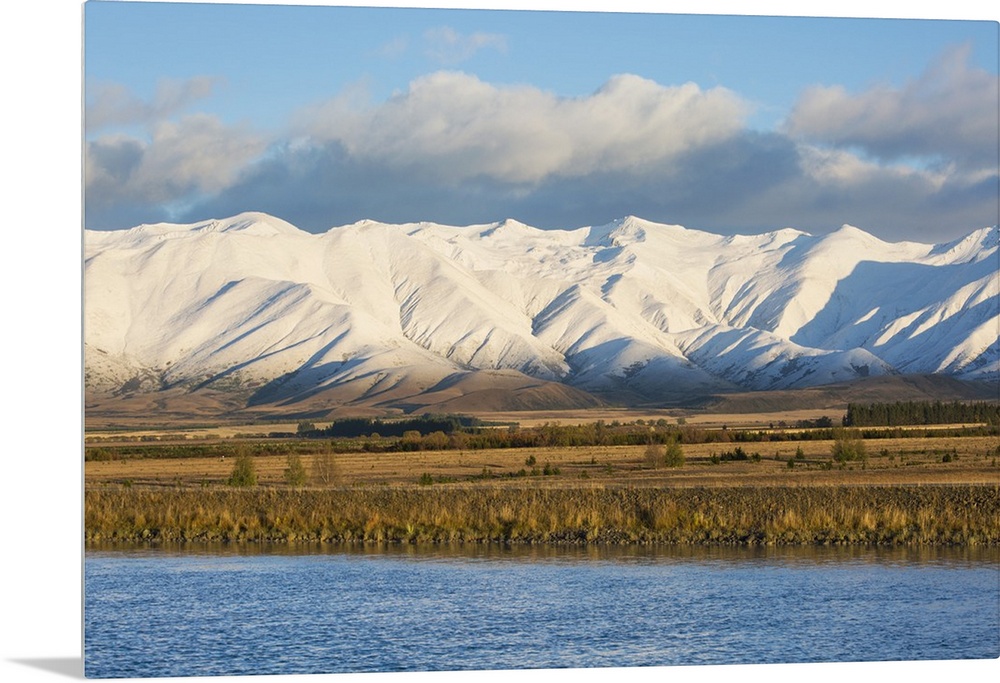 <p>The Ben Ohau Range cloaked in autumn snow, the Pukaki Canal in foreground, Twizel, Mackenzie district, Canterbury, South Island, New Zealand, Pacific</p>