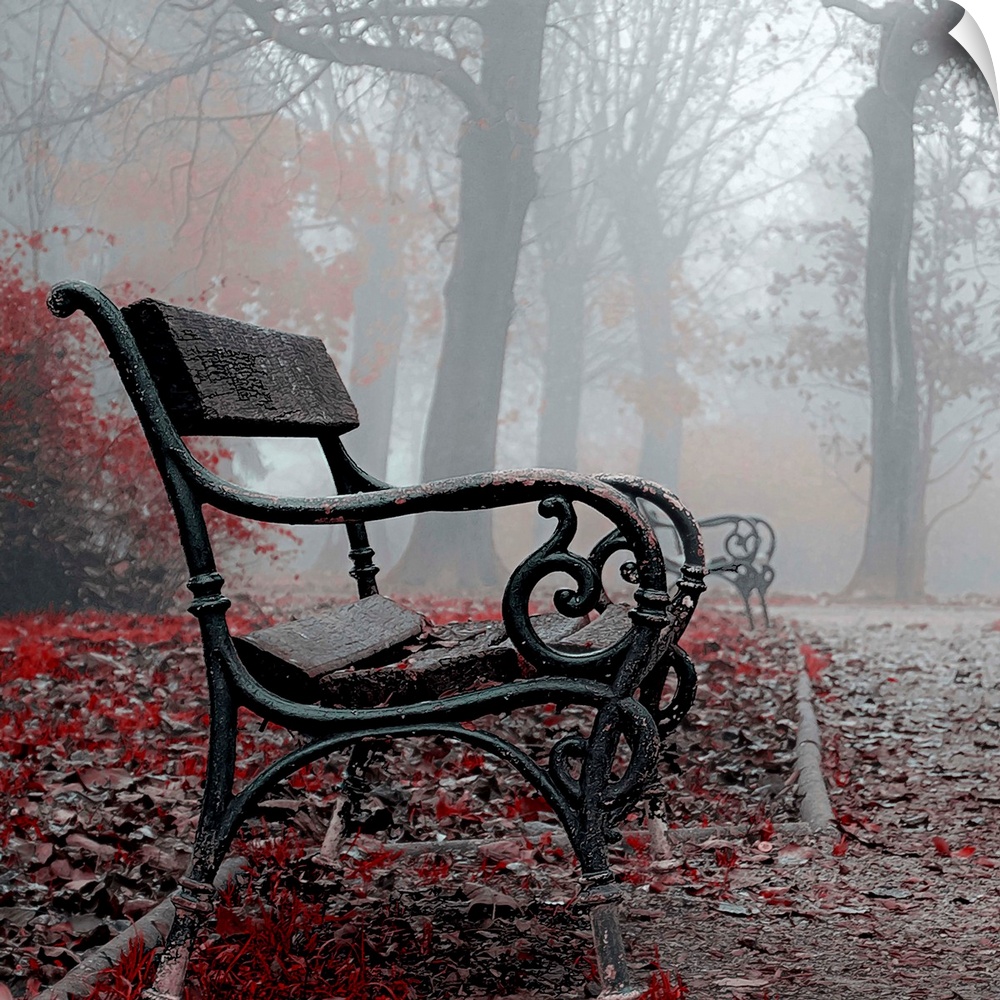 <p>A black metal bench in a foggy park, with red autumn leaves surrounding it.</p>
