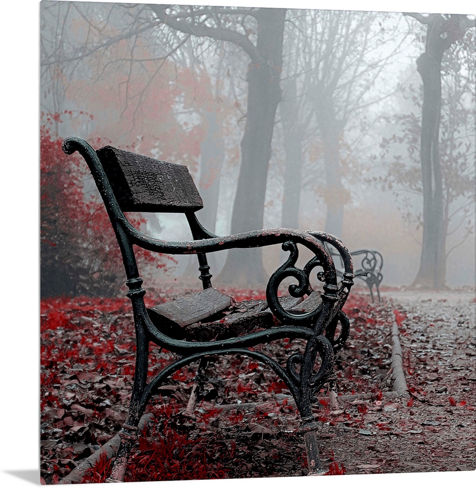 <p>A black metal bench in a foggy park, with red autumn leaves surrounding it.</p>