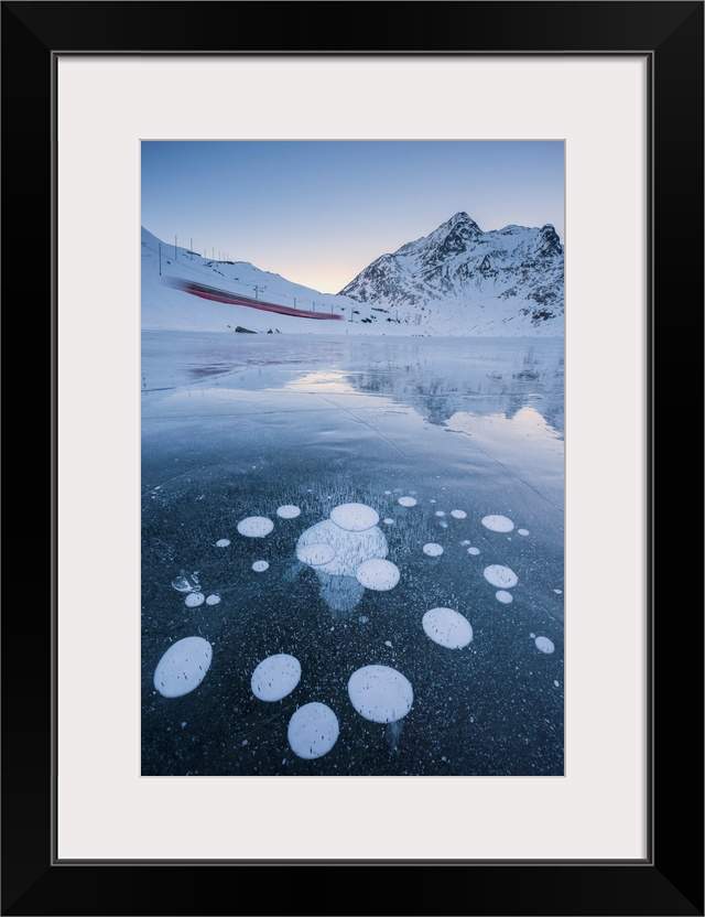 <p>The Bernina Express Train Runs Along The Frozen Lake Bianco, Bernina Pass With Some Bubbles, Canton Of Graubuden, Engadine, Switzerland, Europe</p>