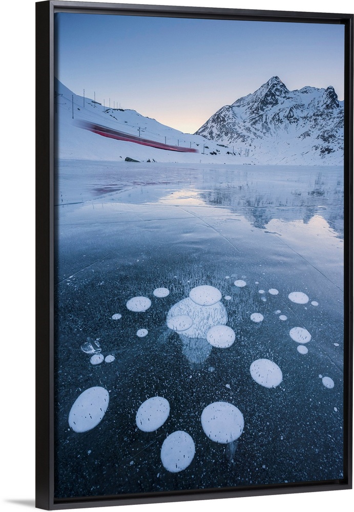 <p>The Bernina Express Train Runs Along The Frozen Lake Bianco, Bernina Pass With Some Bubbles, Canton Of Graubuden, Engadine, Switzerland, Europe</p>