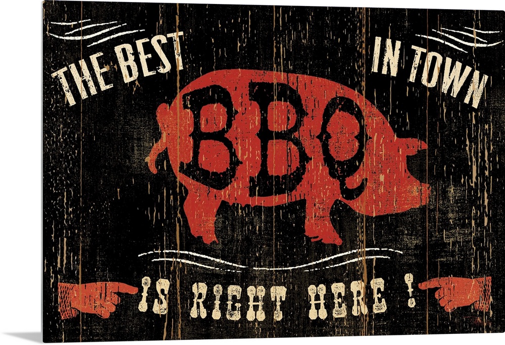<p>Contemporary artwork of an old weathered looking sign, with a red pig silhouette in the center of the image and text in the corners.</p>
