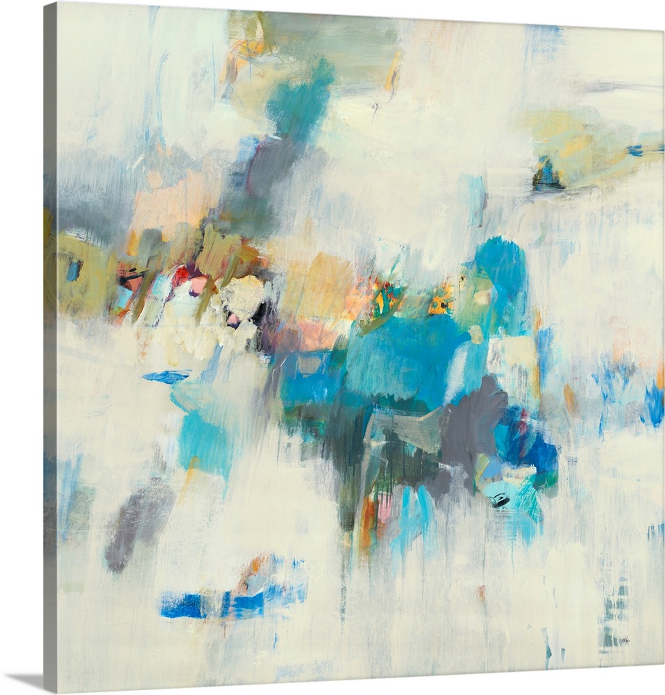 <p>Vibrant abstract painting featuring energetic blue, yellow, and orange brushstrokes against a soft cream background, creating a dynamic and modern aesthetic.</p>
