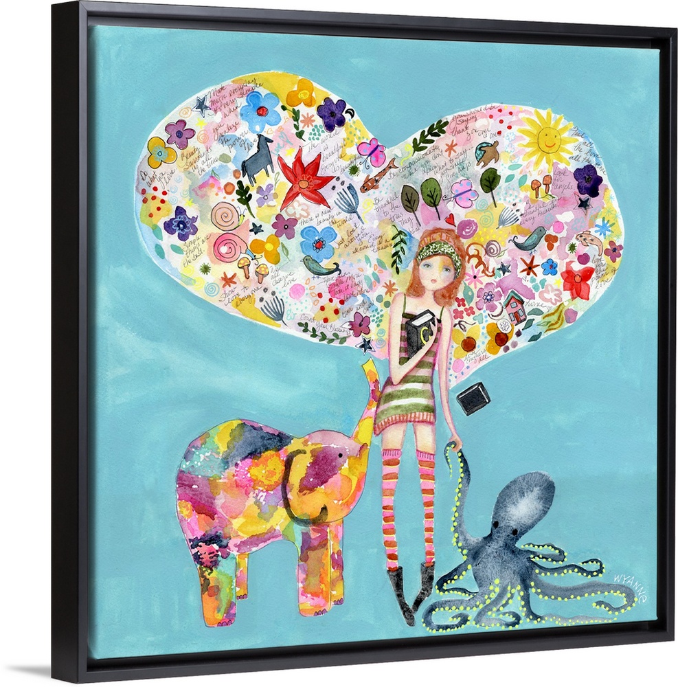 <p>A girl with an elephant and octopus with a heart full of flowers.</p>