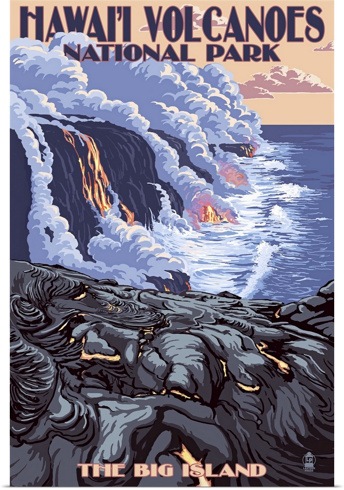 <p>Retro stylized art poster of lava flow from a volcano spilling into the ocean.</p>