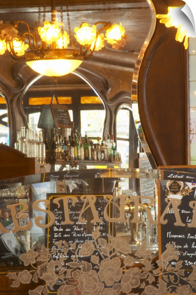 <p>Detail of a glass partition partitioning facetted and engraved etching text Restaurant and a bouquet of flowers. In the background mirrors and the menu, the bar with bottles on the shelt The Bistrot du Peintre is an old fashioned Paris caf.. cafe bar restaurant of art nouveau design with polished brass, mirrors and old signs</p>
