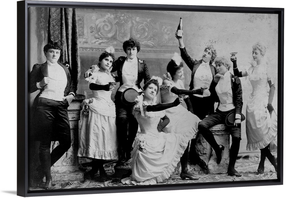 <p>The Black Crook Company, an all-female theater company, in formal attire, drinking champagne.</p>