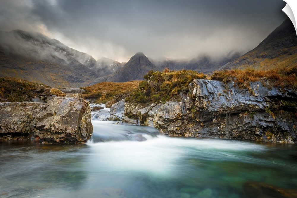 <p>The Black Cuillin mountains in Glen Brittle from the Fairy Pools, Isle of Skye, Inner Hebrides, Scotland, United Kingdom, Europe</p>