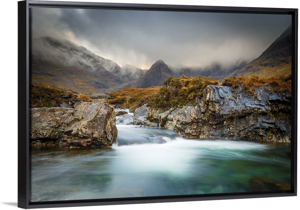 <p>The Black Cuillin mountains in Glen Brittle from the Fairy Pools, Isle of Skye, Inner Hebrides, Scotland, United Kingdom, Europe</p>