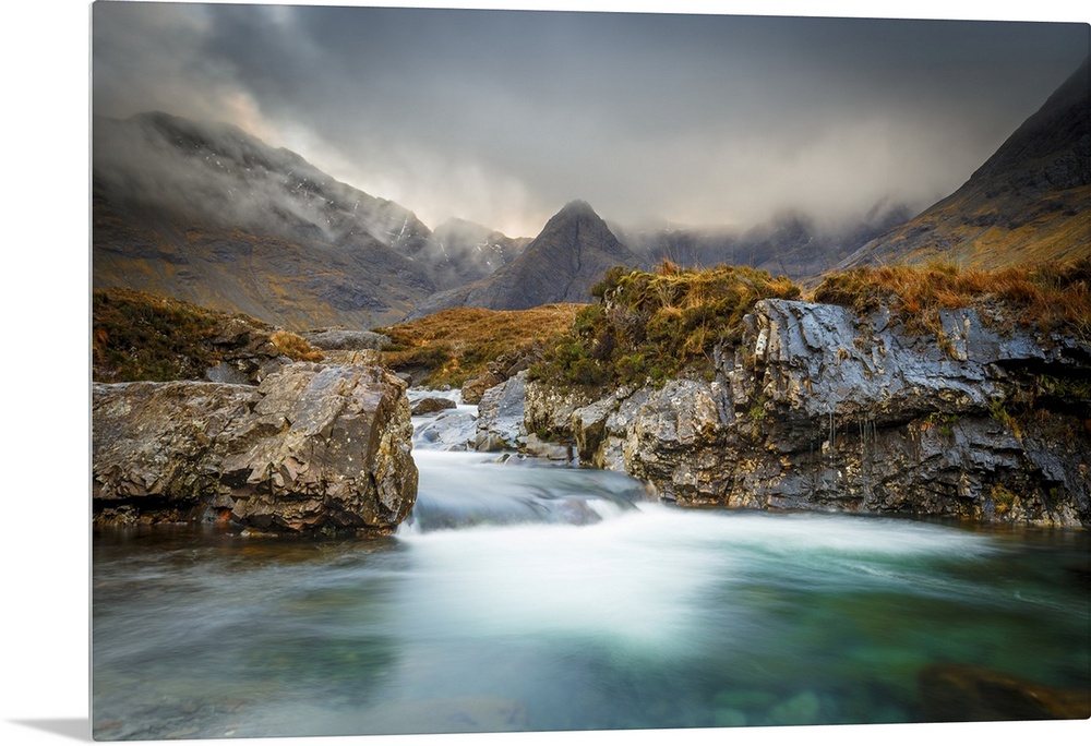 <p>The Black Cuillin mountains in Glen Brittle from the Fairy Pools, Isle of Skye, Inner Hebrides, Scotland, United Kingdom, Europe</p>
